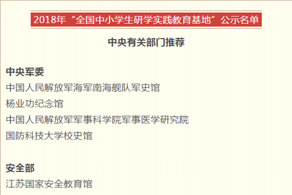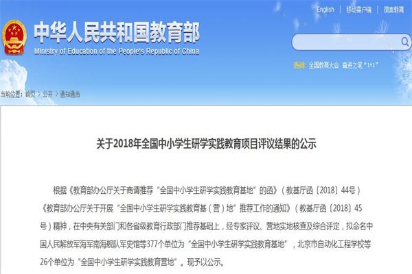 根據《教育部辦公廳關于商請推薦“全國中小學生研學實踐教育基地”的函》(教基廳函〔2018〕44號)《教育部辦公廳關于開展“全國中小學生研學實踐教育基(營)地”推薦工作的通知》(教基廳函〔2018〕45號)精神,在中央有關部門和各省級教育行政部門推薦基礎上,經專家評議、營地實地核查及綜合評定,擬命名國家中印科技國際創新園等377個單位為“全國中小學生研學實踐教育基地”,北京市自動化工程學校等26個單位為“全國中小學生研學實踐教育營地”。