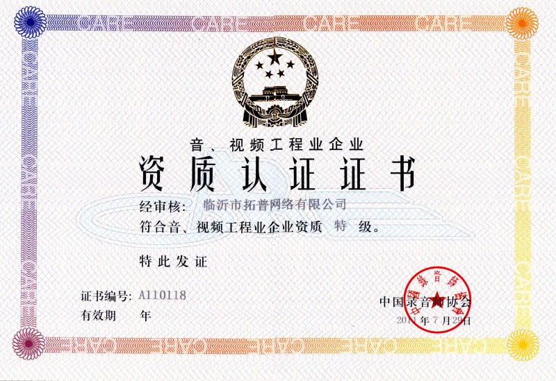 2011年7月29日,經中國錄音師協會對我公司上報的材料審核,評定我公司為音、視頻工程業企業特級資質,并予以頒發工程業企業特級資質認證證書。 音、視頻工程業企業特級資質的獲得,使公司在魯南地區同行業施工資質水平站在最前列。這將大大提高我公司的市場綜合競爭能力和企業信用等級,公司可以為合作單位提供更為優質的服務,為今后數年的大發展打下了堅實的基礎。 特級資質的獲得,是公司發展的又一新的里程碑,消息傳來,公司各崗位員工倍感振奮與自豪,紛紛表示要以更大的工作熱情、更高的工作效率、更強的敬業精神開展工作,充分利用好這一發展平臺,再接再厲、奮發有為,在今后數年時間里推動企業取得跨越式發展、為社會打造更多的精品工程!