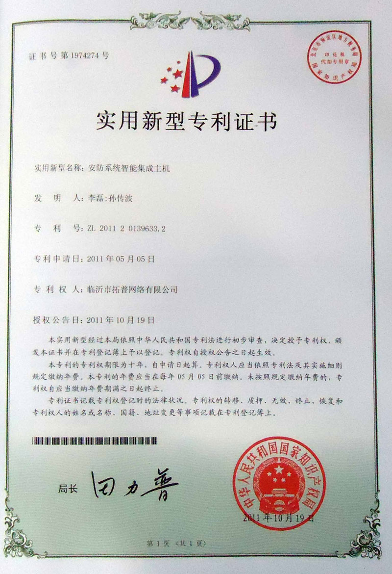 2011年10月19日,由我公司自主研發的安防系統智能集成主機獲得國家實用新型專利證書。該主機是一種新型的安防裝置,將周界報警、視頻丟失檢測報警、RFID停車場、閉路電視監控、短信電話提示等實現信息的共享,融合為一個系統的安防系統智能集成主機,同時解決現在電腦自帶的單個物理串口無法滿足多個安防系統共存的問題。 近年來,公司的自主研發能力不斷增強,技術水平不斷突破,獲得一個又一個專利和各種資格認證,各種自主研發的產品已在國內外多個省市推廣應用,并多次獲得國家、省、市級獎項,取得了良好的社會、經濟效益。這次安防系統智能集成主機專利的獲得是對我公司技術水平和研發能力的又一次認可。 作為員工,我們為公司取得的成績感到驕傲和自豪,公司的發展壯大離不開每一位員工的辛勤工作和自我奉獻。在今后的工作中,我們要以更大的工作熱情、更高的工作效率,更強的敬業精神,用心工作,充分利用公司提供的這一平臺,開拓創新,奮發有為,實現公司的跨越式發展。