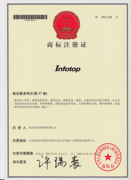 根據公司的申報,2012年1月14日國家工商行政管理局局長許瑞表簽發由中華人民共和國國家工商行政管理總局商標局頒發的第8951188號商標注冊證。 這次商標認證,是我公司在原有核定服務項目(第38類):“信息傳遞;計算機終端通訊;計算機輔助信息和圖像傳輸;計算機輔助信息和圖像傳送;光纖通訊;提供與全球計算機網絡電訊聯接服務;遠程會議服務;提供全球計算機網絡用戶接入服務(服務商);提供數據庫接入服務;語音郵件服務”的基礎上,將服務項目擴展到(第37類),包括:建筑施工監督;建筑結構監督;建筑信息;維修信息;建筑;電器設備的安裝與修理;辦公室用機器和設備的安裝、保養和維修;調色墨盒的再填充;計算機硬件安裝、維修和修理;防盜報警系統的安裝與維修。這是我公司發展中的又一盛事,是公司在軟件研發、射頻技術研究、智能化工程、物聯網技術研究等業務方面,實現跨越式發展的重要標志。是公司提供更為優質的服務,拓展公司市場綜合競爭能力和企業信用等級,成為準入國內外市場的重要標志,是公司跨越發展中一個新的里程碑。 國家工商總局再次為我公司進行商標認證,進一步擴大了公司的業務范圍,為公司籌建中印軟件產業園奠定了良好的基礎,全體員工紛紛表示要乘勢而上、奮發進取,再創佳績。