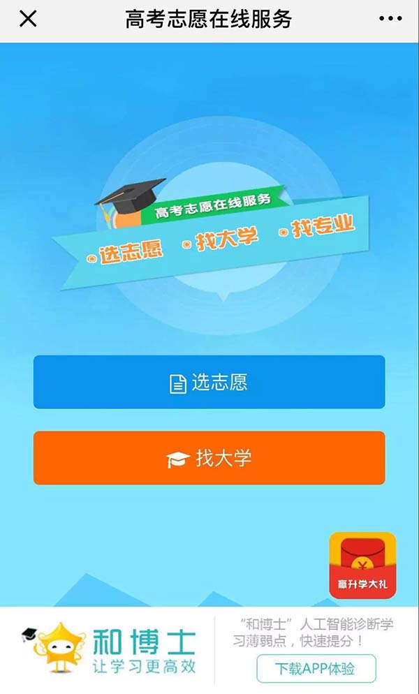 高考志愿填報系統(tǒng) www.2156.cn 此外,為更為精準、科學地為廣大考生提供高考志愿填報服務指導,和博士基于臨沂大數據中心、云計算技術,推出免費高考志愿在線服務系統(tǒng)(www.2156.cn)。在和博士教育公眾號菜單中選擇『高考志愿』點擊“高考志愿免費查詢”即可進入。