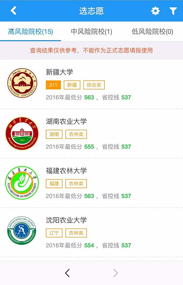 在和博士高考志愿在線服務系統(tǒng)當中,點擊『選志愿』輸入分數等信息就可以獲得系統(tǒng)為您預測的學校。分為高風險,中風險和低風險院校。
