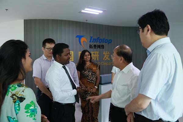 李喆書記一行聽取產品介紹 在拓普公司董事長王嵐保的陪同下,李喆一行先后參觀了園區研發中心、臨沂大數據中心、山東智慧教育信息化應用能力培訓基地、山東智慧教育創客活動中心、國際研發中心等地。在山東智慧教育信息化應用能力培訓基地,李喆書記一行聽取了董事長王嵐保關于“拓普智慧教育云平臺”、“和博士學業測評系統”兩款公司產品的詳細匯報。