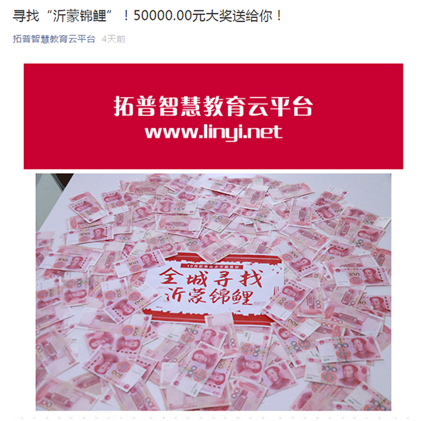 據(jù)了解,本次“尋找沂蒙錦鯉”抽獎活動10月10日發(fā)起于拓普公司公眾號“拓普智慧教育云平臺”,是一個面向廣大粉絲的福利活動,只要在活動期間關(guān)注公眾號“拓普智慧教育云平臺”轉(zhuǎn)發(fā)活動文章,并下載注冊“和博士”APP即可報名參與抽獎。