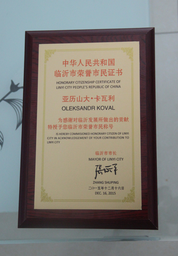 | 祝賀公司烏克蘭亞歷山大·卡瓦利博士榮獲“臨沂市榮譽市民”稱號 |