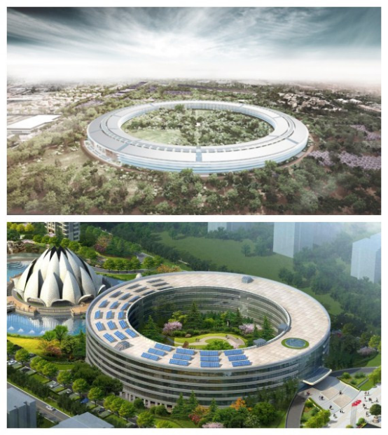 蘋果公司正在其加州總部附近建設(shè)名為“太空船”的新園區(qū)大樓,這個(gè)引領(lǐng)世界科技潮流的公司展示給世界的“最具科技感”建筑,卻被眼尖人士發(fā)現(xiàn)它和我公司建設(shè)的中印軟件產(chǎn)業(yè)園極為神似。