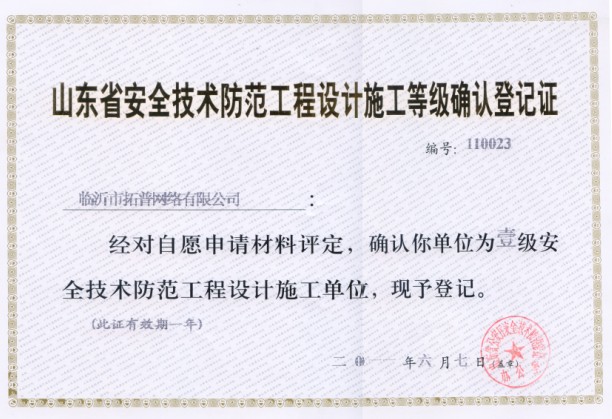 2011年6月7日,經山東省濟南市公安局技術防范辦公室對我公司材料評定,確認我單位為一級安全技術防范工程設計施工單位,并予以頒發《山東省安全技術防范工程設計施工等級確認登記證》。 山東省安防一級資質證書的獲得,說明公司將安全技術防范工程設計施工與傳統優勢的網絡安全及軟件等業務進一步有機結合,使公司的業務體系更加完善,為用戶提供更加全面、可靠、安全、優質的整體解決方案。這標志著公司在安防系統業務拓展達到了新的高度,是公司工程服務能力的一次質的飛躍。 附: