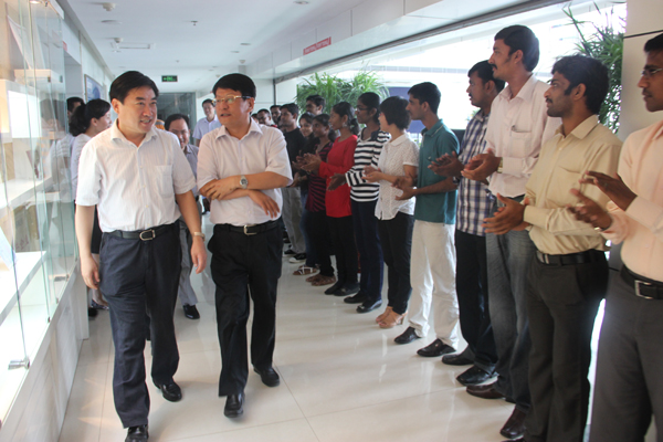 8月29日,市委常委、常務(wù)副市長左沛廷帶領(lǐng)全市重點項目建設(shè)推進現(xiàn)場會與會人員來臨沂經(jīng)濟開發(fā)區(qū)參觀考察,并到臨沂市拓普網(wǎng)絡(luò)有限公司視察指導(dǎo)工作,臨沂經(jīng)濟開發(fā)區(qū)黨工委副書記、管委會副主任鄒際國陪同。 拓普網(wǎng)絡(luò)公司總經(jīng)理王嵐保向左沛廷市長一行詳細介紹了公司“中印軟件產(chǎn)業(yè)園”的籌備建設(shè)情況、以及引進印度籍專家40余人的工作生活情況,并對公司的發(fā)展狀況、研發(fā)項目和發(fā)展前景做了重點匯報。 左沛廷市長一行參觀了公司的榮譽墻,對拓普網(wǎng)絡(luò)公司在物聯(lián)網(wǎng)、智能化系統(tǒng)研發(fā)取得多項自主知識產(chǎn)權(quán)專利證及獲得中國國際博覽會金獎等研發(fā)成果給予了高度評價,對拓普網(wǎng)絡(luò)公司的發(fā)展狀況給予了充分肯定,對于引進40余名印度籍專家的做法表示高度認可。 左沛廷市長表示,能一次性引進這么大規(guī)模的印度籍專家,這在全市乃至全省都是第一次,利用外國先進的研發(fā)理念和技術(shù),來促進成果轉(zhuǎn)化,這對臨沂市軟件行業(yè)的發(fā)展會有很大的推動作用。同時,左沛廷市長指出,“中印軟件產(chǎn)業(yè)園”要盡快建設(shè)爭取早日投入運營,市委、市政府將一如既往的大力支持高新企業(yè)的發(fā)展,支持重點項目的建設(shè)。