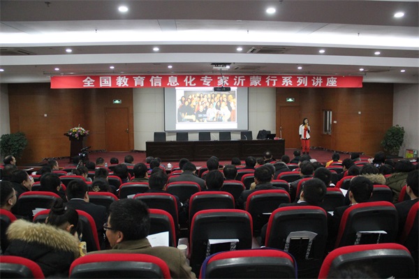 2017年1月5日,臨沂市第三期“全國教育信息化專家沂蒙行”系列講座在中印軟件產業園小禮堂成功舉行。本次系列講座特邀美國圣地亞哥州立大學教育技術與傳媒系王敏娟教授作題為“教育技術現場及其應用”、“移動學習設計和增強現實制作”的報告,市教科研中心副主任陳為詞、公司副總經理朱傳博等領導出席,來自臨沂市各縣區共計400余名校長及骨干老師參加了本次會議。